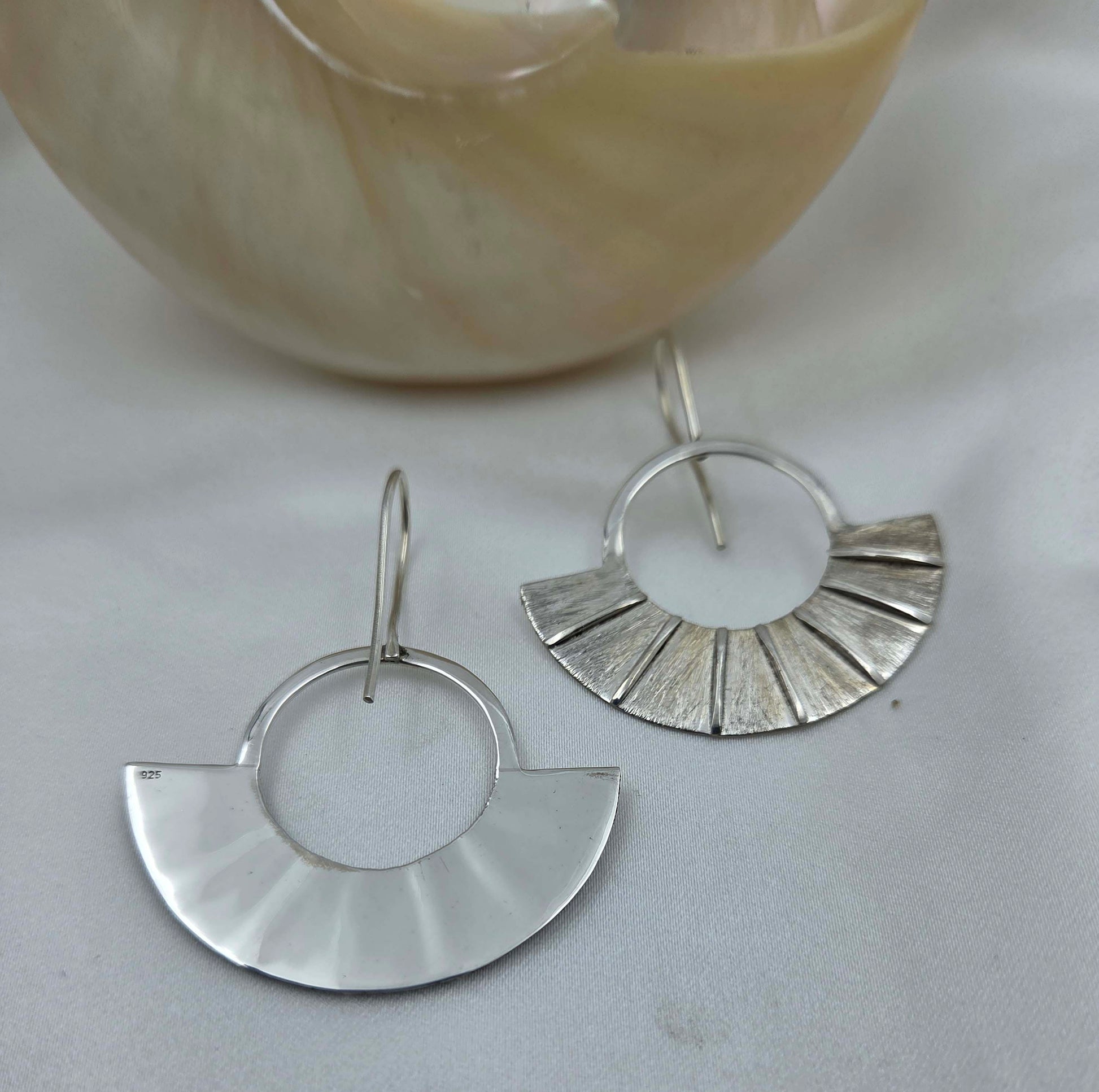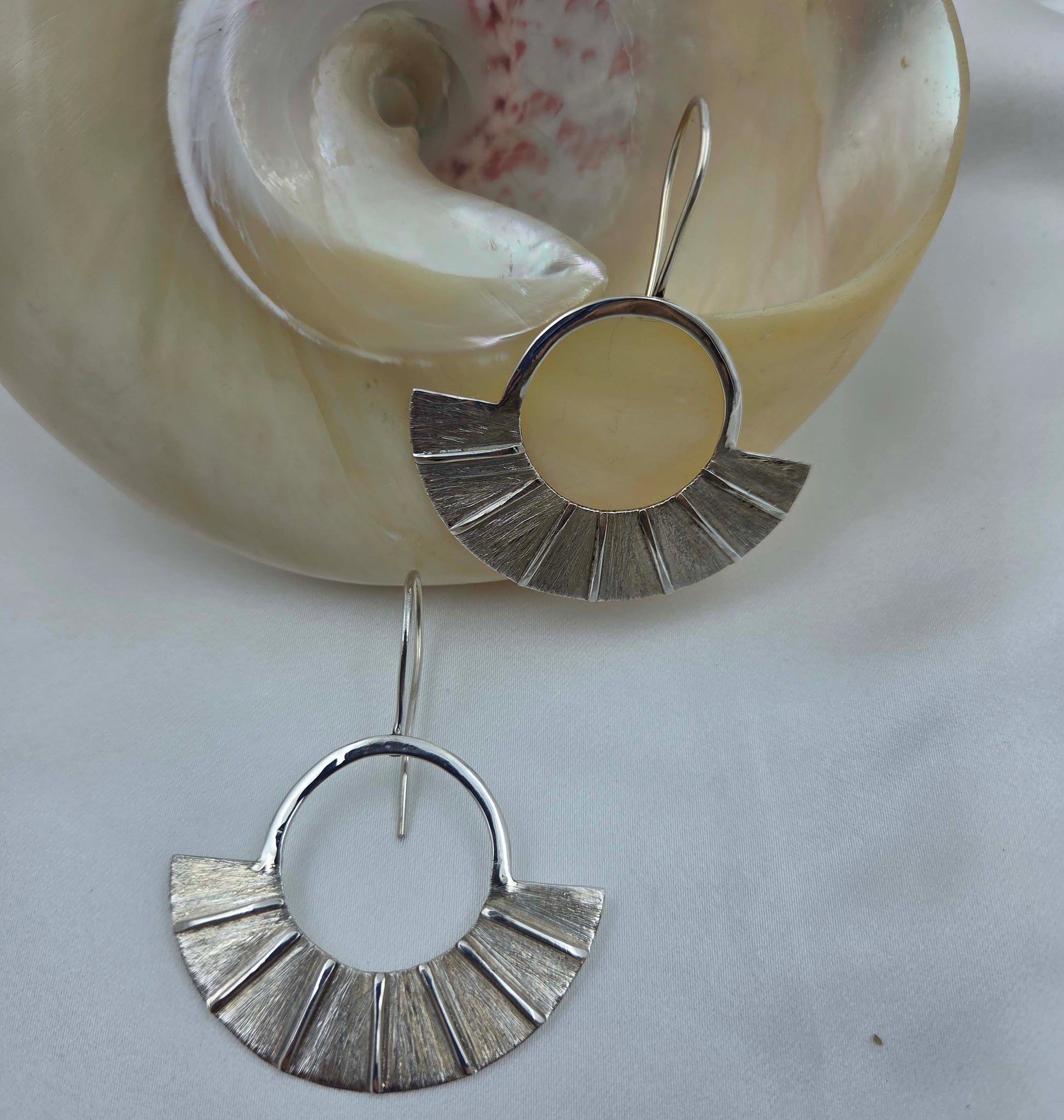Inspired by the morning sun, these earrings capture the play of rays breaking through the horizon. The brushed silver fans out like beams of light, symbolising warmth, beginnings, and endless possibilities.